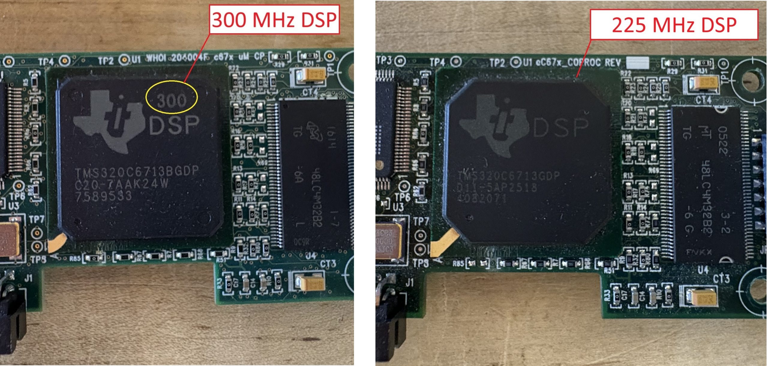 - See the coprocessor board images below showing the presence or lack of the “300” silkscreen on the DSP chip. There is no way to probe in firmware for whether a chip is 300MHz or 225MHz. The silkscreen is the only indicator.